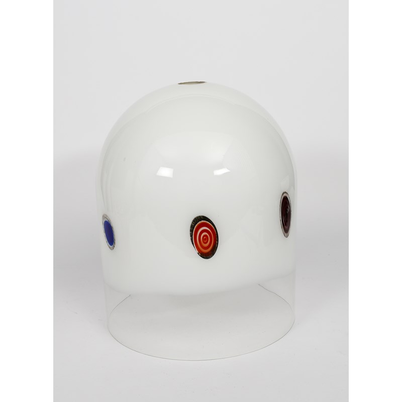 A large Murano glass shade, domed white glass with clear rim, internally decorated with murine, applied Murano label, 43cm. high