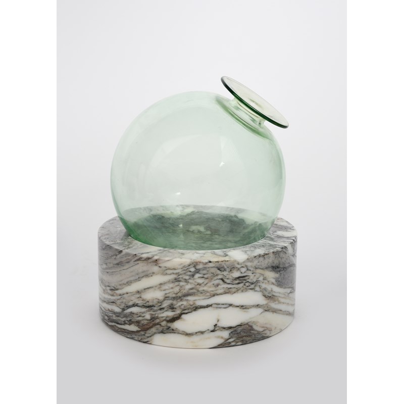 Φ A Venini Luna vase designed by Ettore Sottsass, 1997, the round, pale green glass body with flaring neck, resting inside a circular white and grey veined marble base, etched Ettore Sottsass 1/29 Venini 97 and retail plastic label to glass, 22cm. high (glass), 27.5cm. high (overall height), (2)