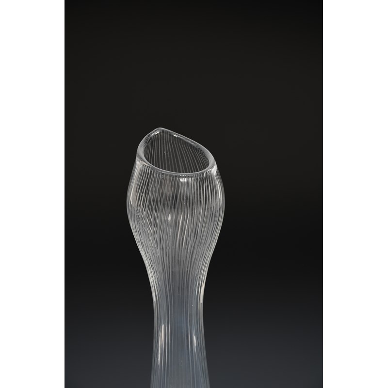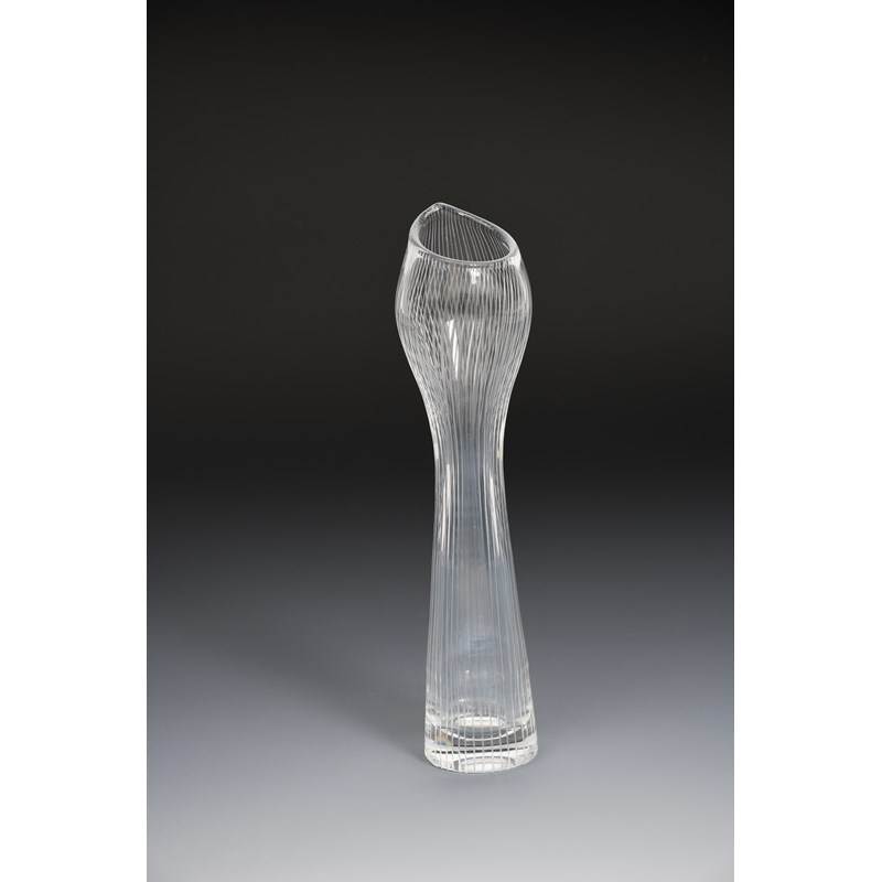 An Iittala glass vase designed by Tapio Wirkkala, slender, swollen cylindrical form with vertical cut lines etched Tapio Wirkkala Iittala to base, 23cm. high
