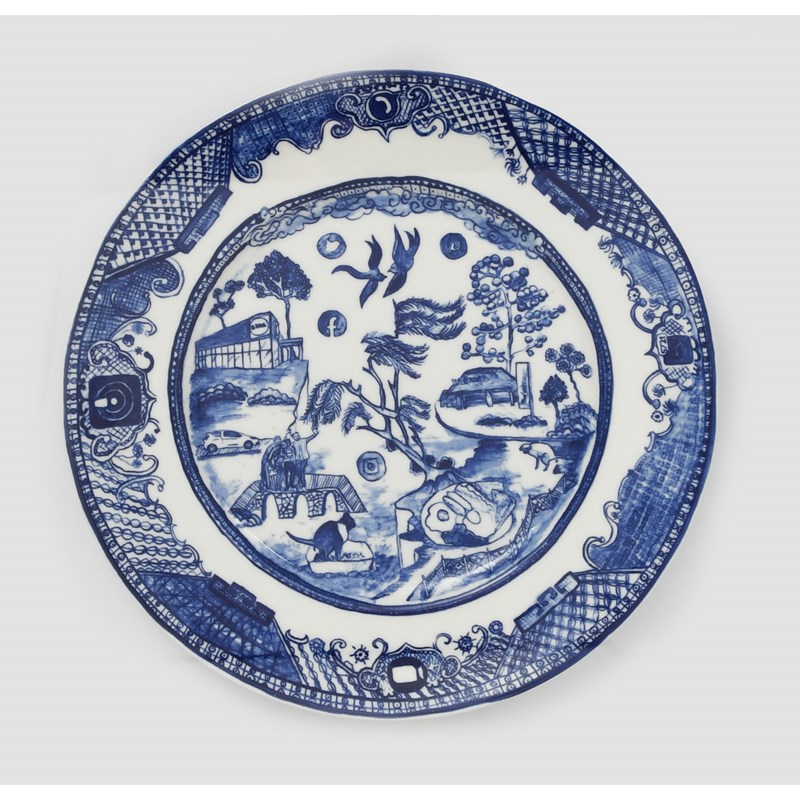 earthenware plate made for Grayson Perry's Art Club, printed in blue and white, framed