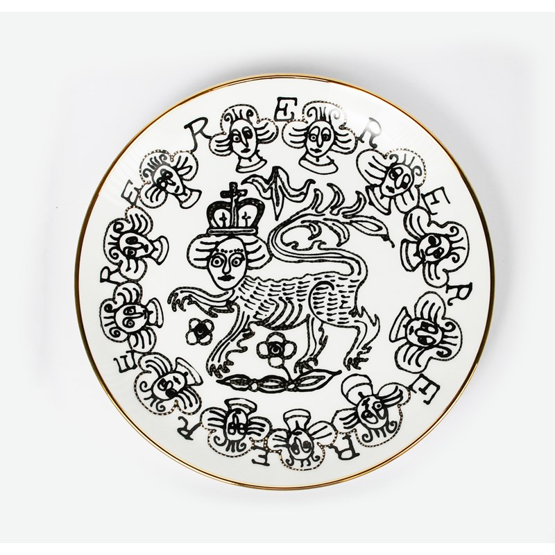 a plate, printed with heraldic lion and border of portrait busts and ER monograms in black, the rim highlighted in gilt, framed