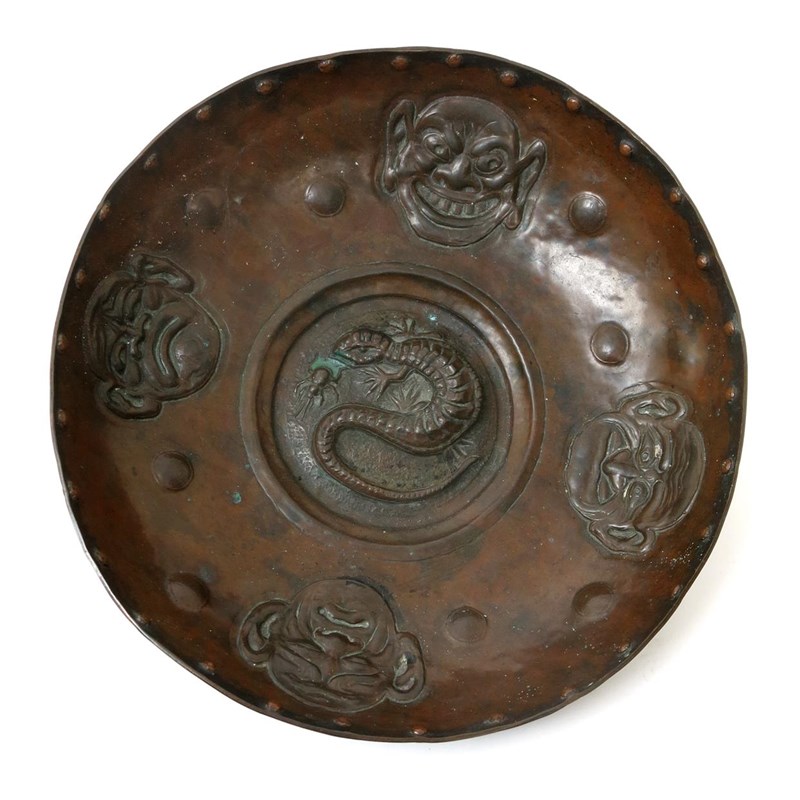 A repousse hammered patinated copper bowl in the manner of John Pearson, the well hammered with a roundel of a lizard about to attach a beetle, the rim with four Japanese mask panels, and stud border, unsigned, 28cm. diam.