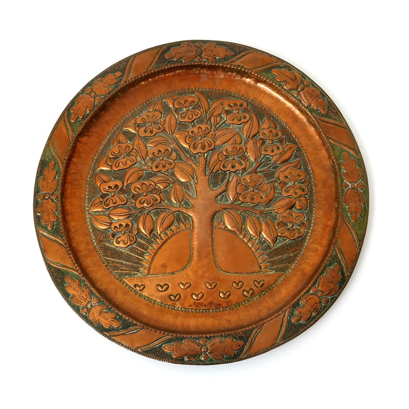 A large John Pearson repousse copper wall charger, dated 1897, the well decorated with a stylised blossom tree before a rising sun, the rim with a band of flowerhead decoration, stamped J Pearson, 1897, 51.5cm. diam.