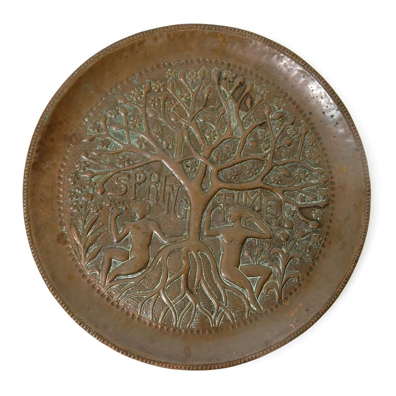 A John Pearson patinated repousse copper charger dated 1898, circular, hammered in relief with Adam & Eve below a flowering tree, titled Spring Time, etched J Pearson 1898, numbered 2401, 31cm. diam.