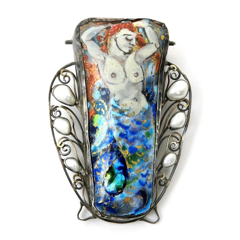 A George Hunt silver and enamel Mermaid clip brooch, dated 1933, tapering rectangular section enamel, inside wirework frame set with blister pearls, stamped mark, signed G Hunt 1933 to reverse of enamel, 7cm. high