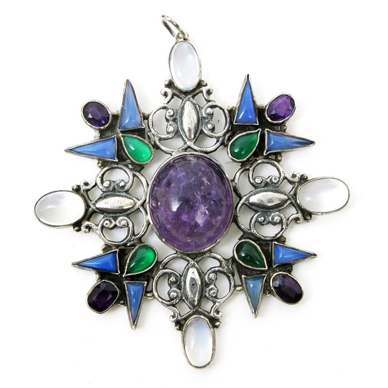A silver pendant necklace the design attributed to Sybil Dunlop, pierced wirework frame set with amethyst, moonstones and other stones, unmarked, 8cm. wide