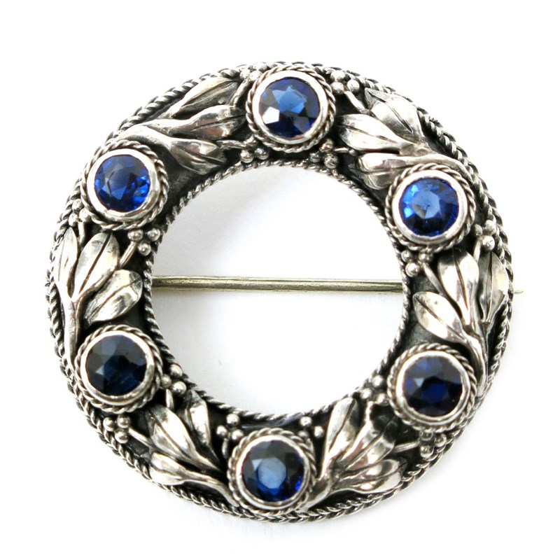 A silver mounted circular brooch in the manner of the Artificers Guild, cast with a frieze of foliage and rope twist borders, set with six sapphire stones, unmarked, 3.5cm diam.