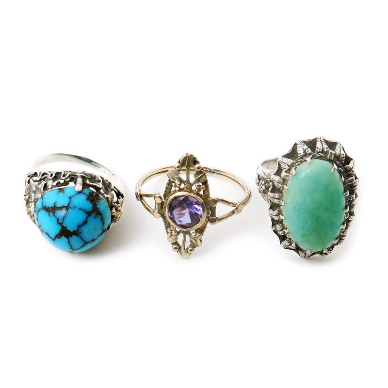 A turquoise mounted silver ring in the manner of the Artificers Guild, cast with grapevine decoration set with large turquoise stone, another set with chrysoprase stone and another smaller ring unsigned (3)
