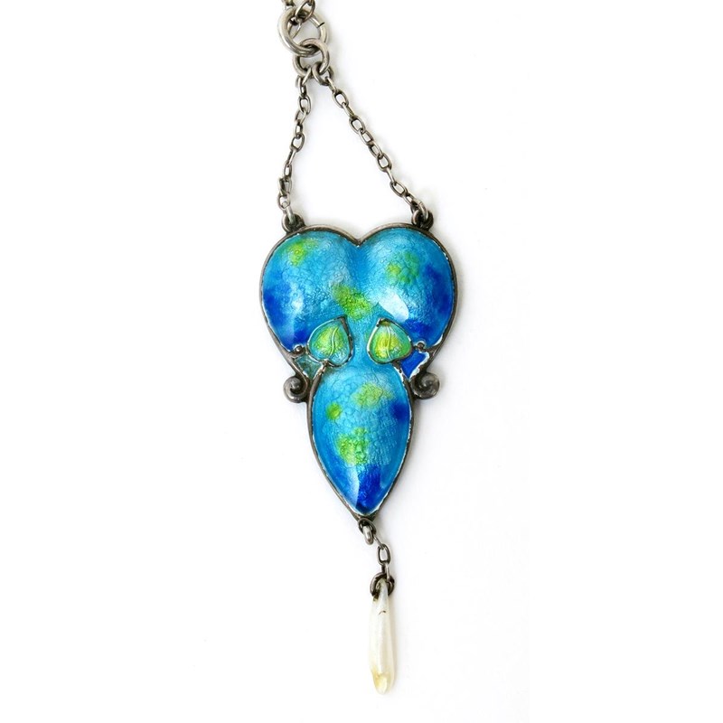 A Gourdel Vales & Co silver and enamel pendant, trilobed form, cast in low relief with foliate borders, enamelled green and blue, with natural pearly slender drop, indistinct marks under enamel, 5cm. long