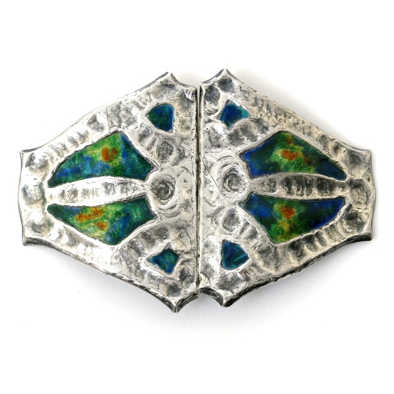 A Liberty & Co Cymric silver and enamel belt buckle, diamond shaped, cast in low relief with a Butterfly motif, enamelled green, blue and red stamped marks, Birmingham 1903, 8cm. wide