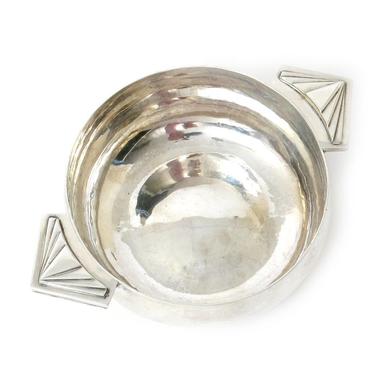 An R.E. Stone silver porringer made for The Goldsmiths & Silversmiths Company, with cast faceted triangular handles, hammered finish, stamped marks, London 1938, 16cm. wide