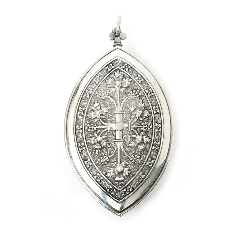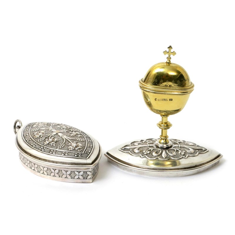 A John Hardman & Company silver travelling communion set, the elliptical case cast in low relief with fleur de lys and berried foliage design, containing silver gilt cup and cover, stamped marks, Birmingham 1868, 11cm. wide (3)