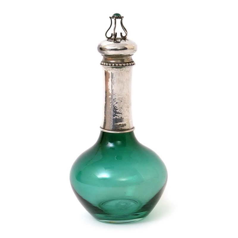 A modern George Hart silver and green glass decanter, originally designed by Charles Robert Ashbee, ovoid glass with cylindrical neck, hammered silver neck, the domed stopper with wirework finial set with chrysoprase, stamped marks, London 1989, 25cm. high