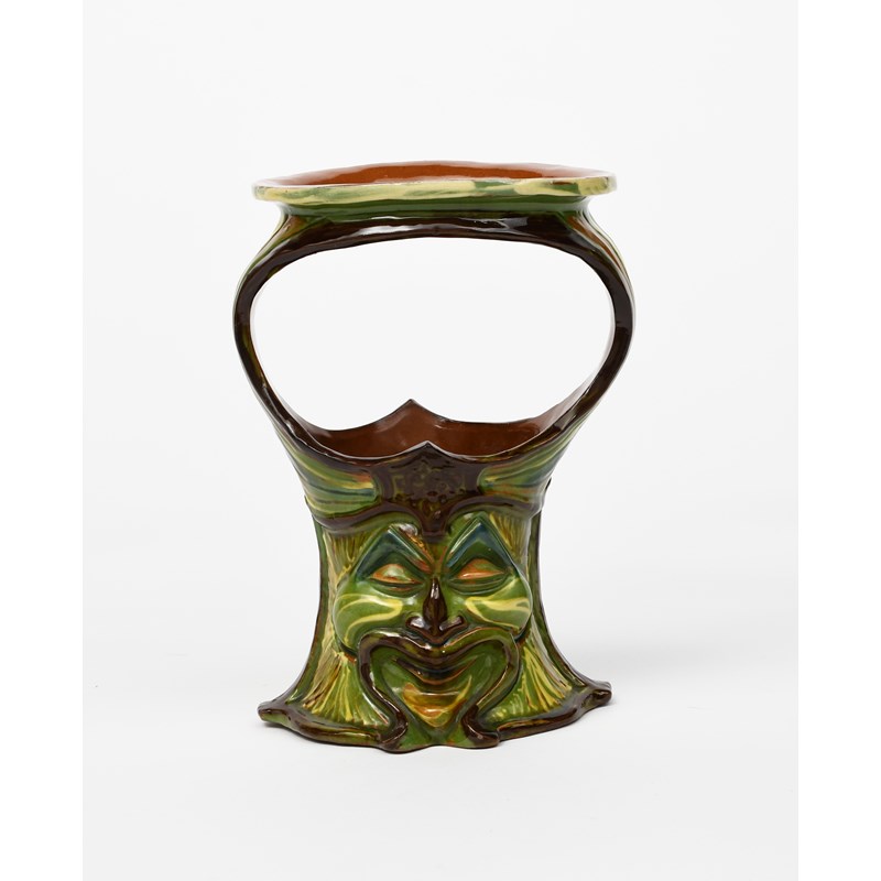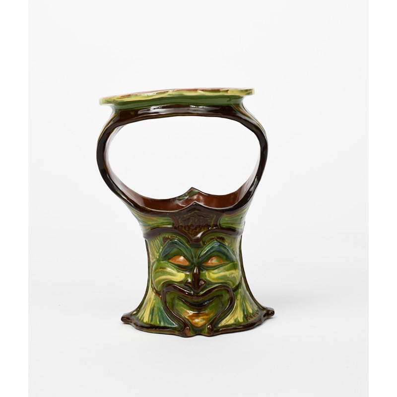 An unusual C H Brannam Barum Ware vase, dated 1900, modelled in relief with a mask with long moustache, the figures hair rising to form an open rim, glazed green, yellow and blue incised marks, restored, 22.5cm. high