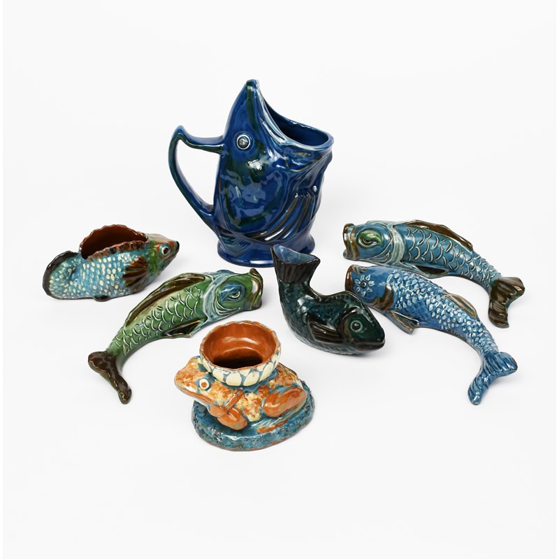 A C H Brannam Barum Ware grotesque frog vase, dated 1897, modelled with a flower on its back, glazed in colours, three fish wall pockets, a fish jug and two other fish vases, incised marks, restoration, 10cm. wide. (7)