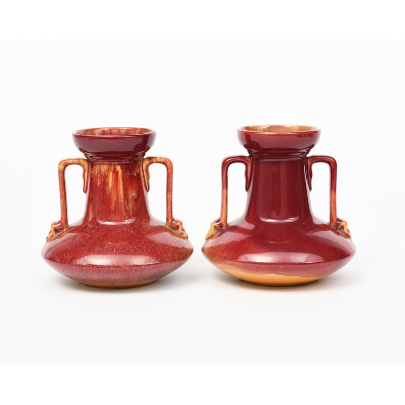 A pair of Linthorpe Pottery vases designed by Dr Christopher Dresser, model no.957, low compressed body with cylindrical neck, covered in a streaked red glaze over yellow, impressed factory marks, HT monogram, 13.5cm. high (2)