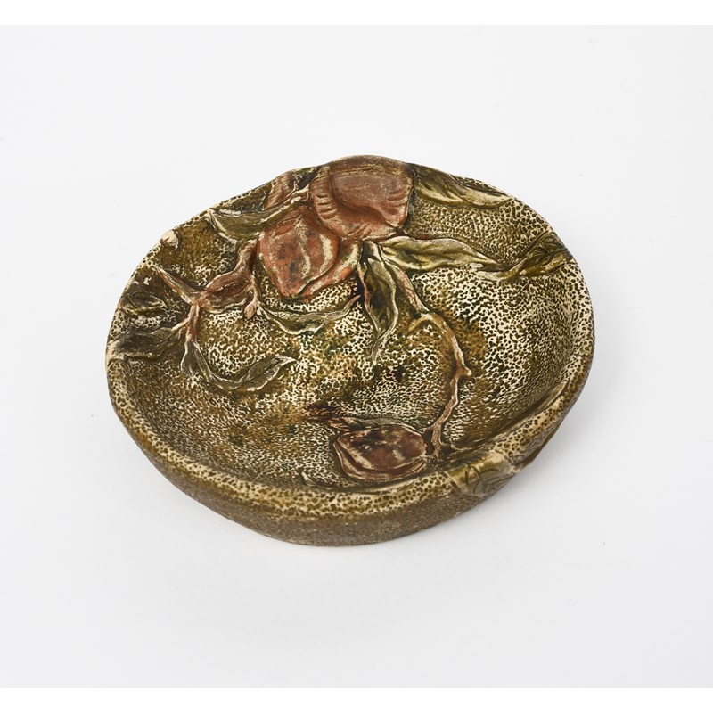 A rare Linthorpe Pottery dish designed by Dr Christopher Dresser, model no.286, Japoniste design, circular form moulded in low relief with a fruiting bough, glazed in colours impressed factory marks, facsimile signature, 13cm. high