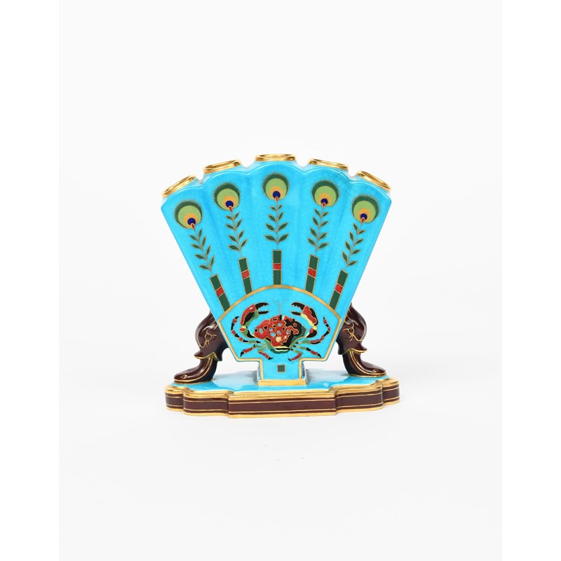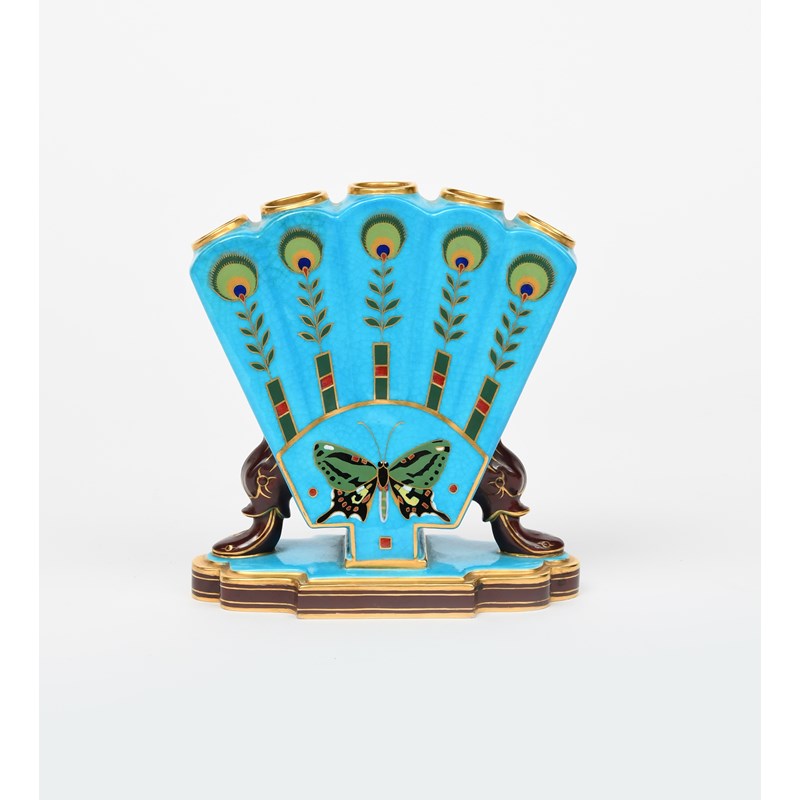 A Mintons Cloisonne vase designed by Dr Christopher Dresser, retailed by Thomas Goode & Co., flaring fan shaped body on flaring mask feet and stepped base, with five circular aperture, printed and enamelled in colours and gilt with a butterfly below peacock feathers, the reverse with a crab below peacock feathers, in colours and gilt on a turquoise ground, printed factory mark, 16cm. high