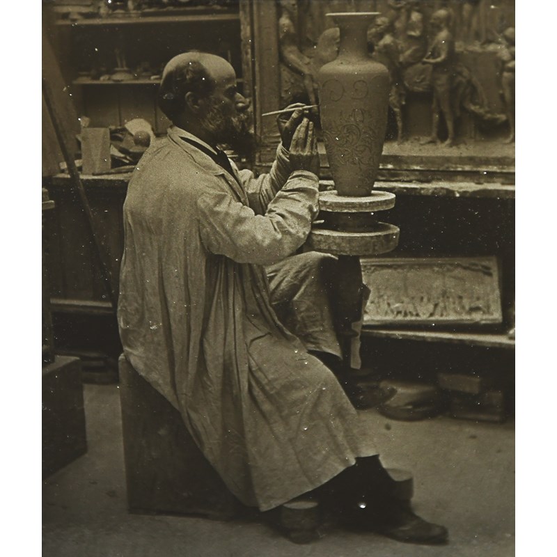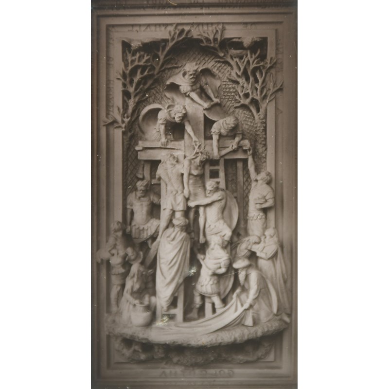 A collection of fifty-nine glass negatives depicting work by George Tinworth, the majority terracotta panels, one a portrait in his studio, (59)