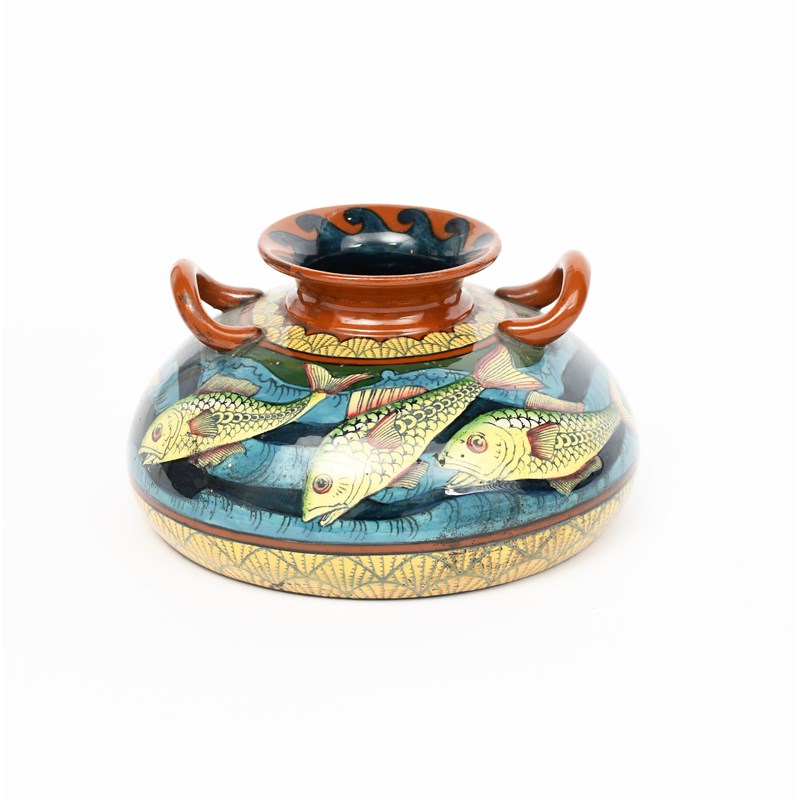 A Foley Intarsio vase, pattern 3169, compressed ovoid form with applied handles and flaring rim, printed and painted in colours with a frieze of scaly fish printed factory marks, 20cm. wide.