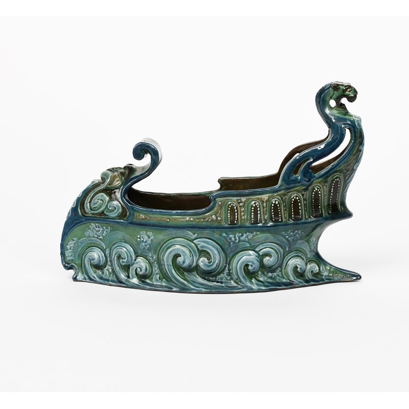 A C H Brannam Barum Ware pottery Galleon centrepiece, dated 1900, pierced and modelled design, glazed in shades of green, brown and blue, incised C H Brannam, Barum 1900, professional restoration, 29.5cm. wide.