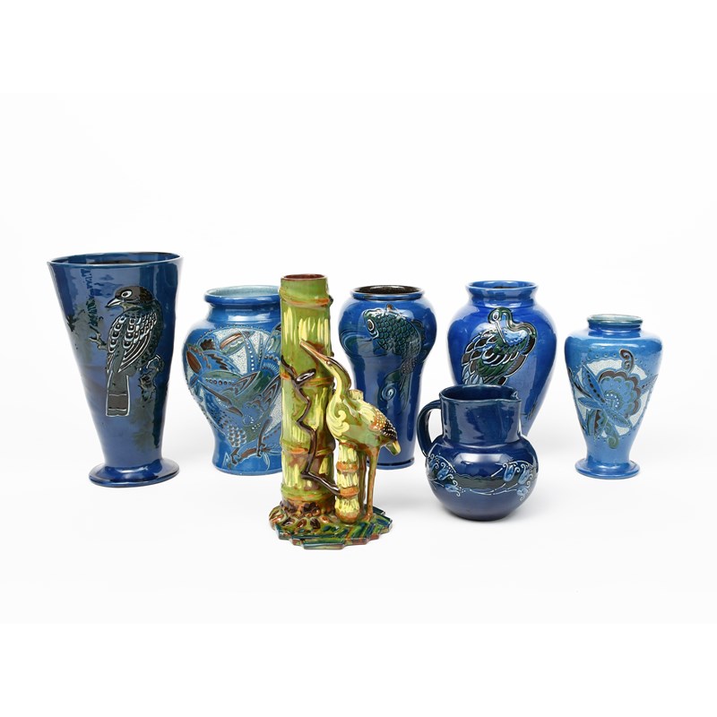 A C H Brannam Barum Ware pottery vase by Frank Thomas, modelled as a heron standing beside a tall bamboo stem painted in cream, brown and blue on a green ground, a C H Brannam vase slip decorated with a bird in colours on a blue ground, another similar, a vase decorated with a scaly fish, a vase decorated with a heron, another vase and a jug decorated with flowers incised marks FT monogram, minor chips, 24.5cm. high (7)