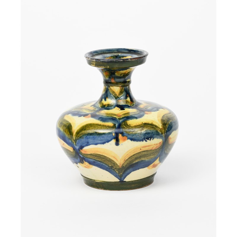 A small Della Robbia Pottery vase by Cassandra Annie Walker, dated 1897, shouldered form with flaring neck, painted with Art Nouveau flower design, in blue, yellow and green on a cream ground, painted mark, CAW and 1897,