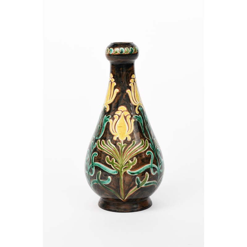 A Della Robbia Pottery vase by Hannah Jones, footed, tapering form with swollen knopped neck, painted with Art Nouveau tulip flowers in yellow, green, turquoise on a chestnut brown ground, incised factory marks, painted HJ monogram, neck rim reduced, minor overpainting to base rim, 30cm. high