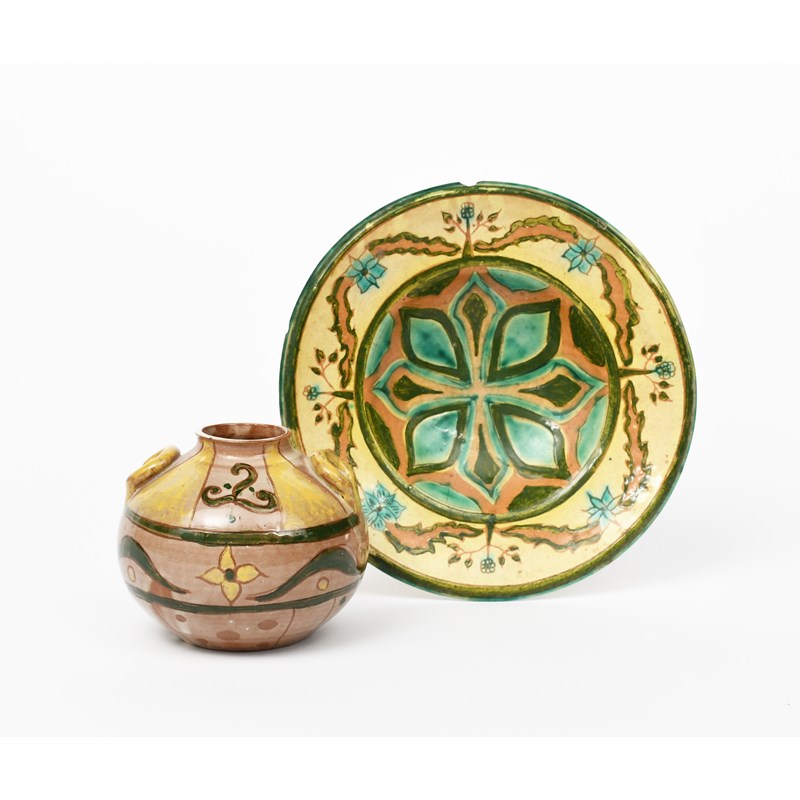 A Della Robbia Pottery vase by EF, ovoid with modelled loop handles, incised and painted with foliate motif in yellow, green and mushroom, and a Della Robbia bowl by Annie Smith dated 1895, incised marks, painted EF monogram, minor glaze chips to vase, chip to rim of bowl, 10.5cm. high (2)