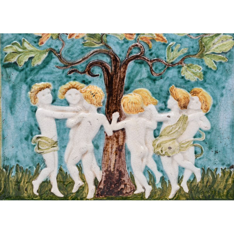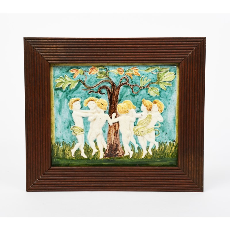 A Della Robbia plaque designed by Ellen Mary Rope, decorated by John Fogo, rectangular form, cast in low relief with children dancing around a tree, in shades of blue, green, brown and yellow, framed, incised marks, JF monogram, 21.5 x 16.5cm.