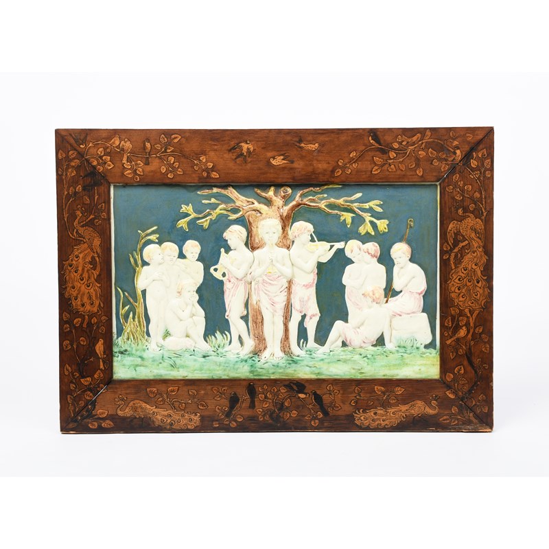 Melody a large Della Robbia Pottery plaque designed by Ellen Mary Rope, rectangular cast in low relief with three young figures playing music gathered around a central tree, as two groups of young figures listen and rest, in colours, in pokerwork wooden frame, incised numbers to reverse, 48 x 29cm.