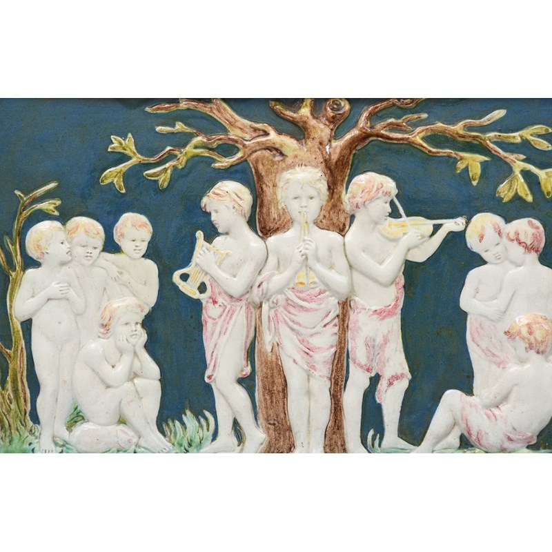 Peter Hyland The Della Robbia Pottery, Birkenhead 1894-1906, Antique Collector's Club, page 207 figure 222 for a related, smaller tile plaque by Rope decorated with children dancing around a tree.