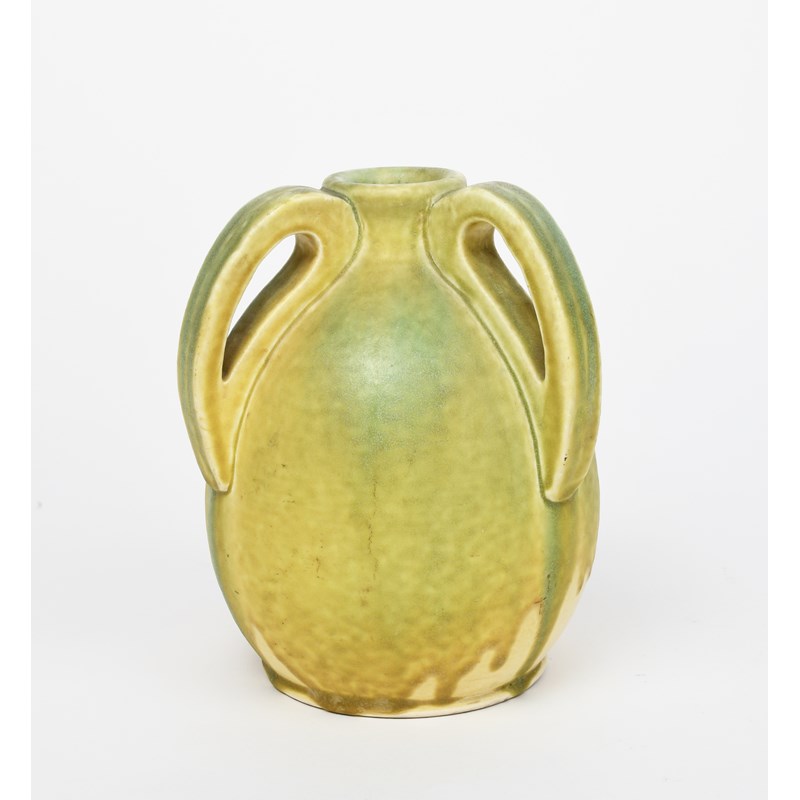A Ruskin Pottery vase, ovoid form with three loop handles, covered in a graduated and running matt yellow glaze, impressed marks, 22.5cm. high