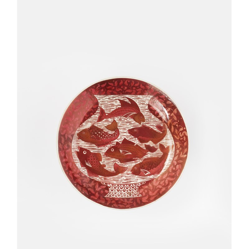 A William De Morgan Pottery lustre charger by Fred Passenger, painted to the well with a vase decorated with a shoal of scaly small fish, the rim a band of foliage, in ruby lustre on a white ground, the reverse with a band of stylised leaves, painted FP, restored, 36cm. diam.