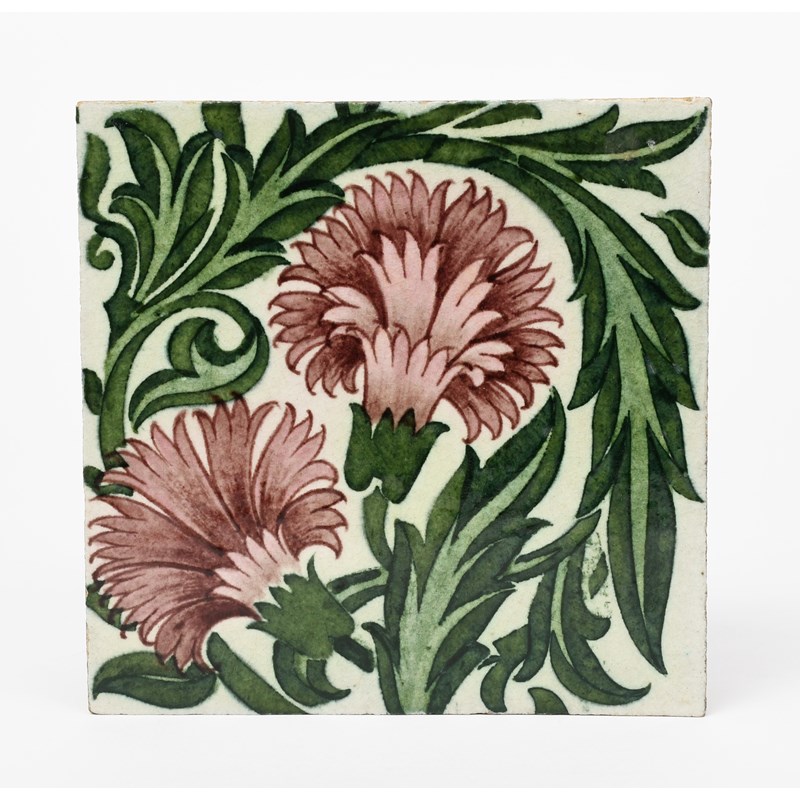 A William De Morgan Late Fulham Period tile, painted with carnations in shades of green and