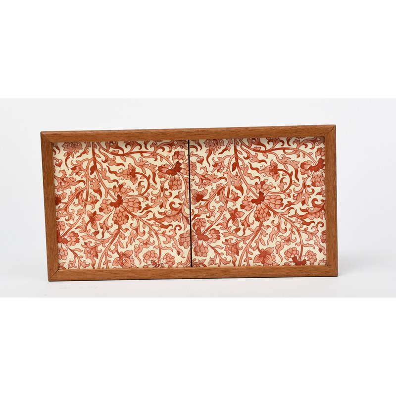 A William De Morgan Late Fulham Period tile, painted with carnations in shades of green and aubergine on a white ground, and a Minton's two tile panel printed with flowers and foliage, framed, impressed De Morgan mark, collection label, 15 x 5.5cm. (2)