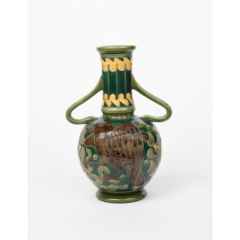 A Burmantoft's Faience Partie-Colour twin-handled vase, 'slip' decorated in low relief with a raven