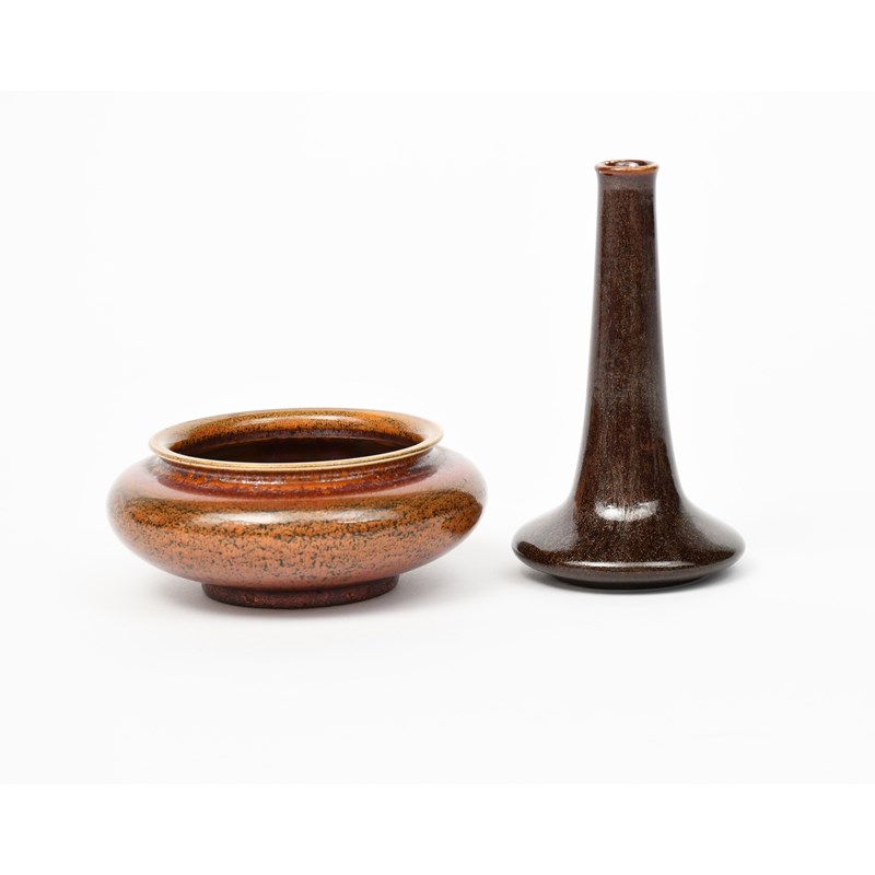 An Ashby Guild solifleur vase, compressed body with tapering cylindrical neck, covered in an aventurine glaze, and a Pilkington's Lancastrian bowl covered in an aventurine glaze impressed marks, 12.5cm. high (2)