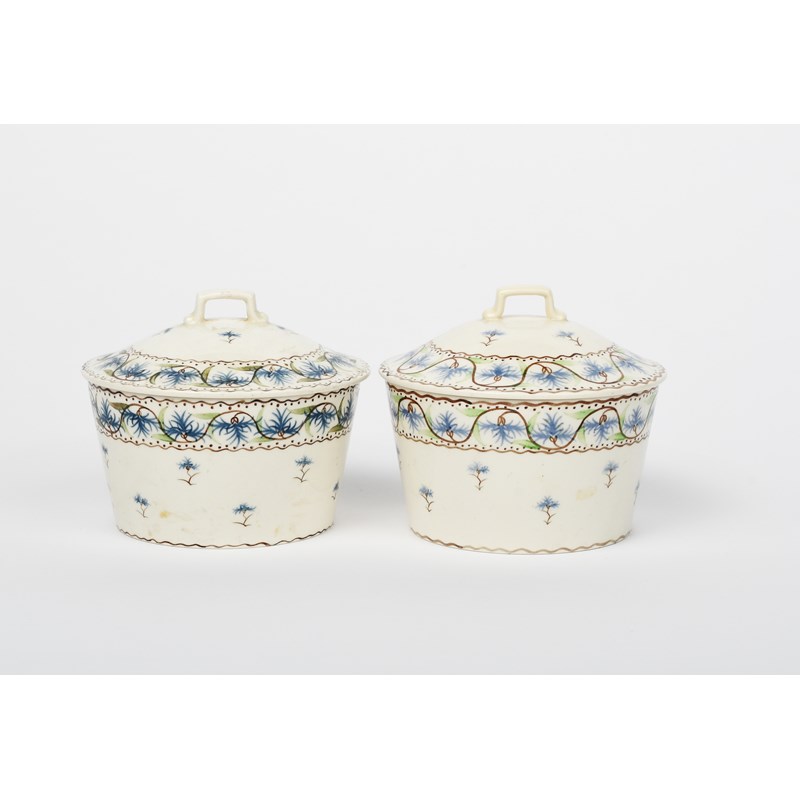A pair of Wedgwood covered pots by Grace Barnsley, numbered 228, painted with bands of cornflowers, in blue, green and brown, on a white ground, impressed marks, painted artist monogram, painted number, professional restored finial, 9.5cm. high (4)
