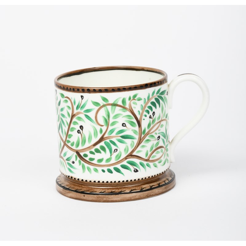A Wedgwood mug, number 1404, painted with scrolling foliage in green and brown, between brown bands,