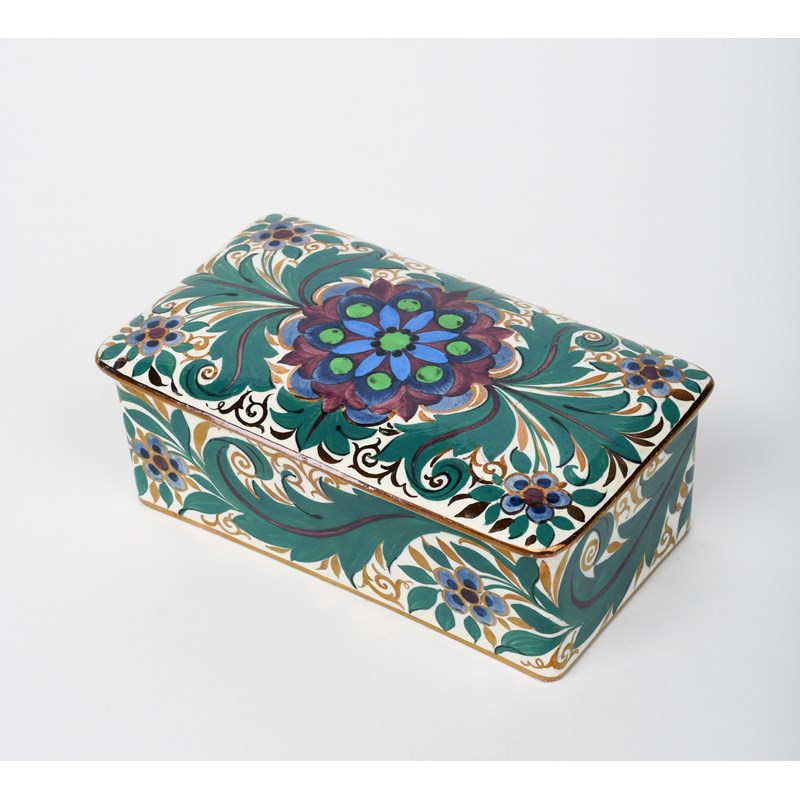 A Wedgwood Rhodian Ware box and cover designed by Alfred Powell, rectangular, painted in colours and