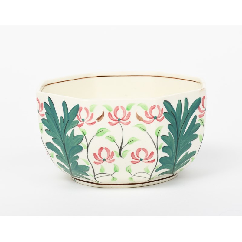 A Wedgwood octagonal bowl designed by Alfred Powell, painted with panels of stylised cyclamen flowers and large foliate columns, in green, pink and brown, impressed marks, painted number, 12cm. diam.