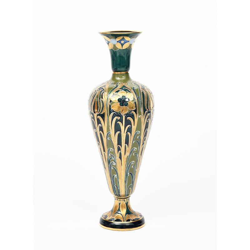 A James Macintyre Green and Gold Florian Ware vase designed by William Moorcroft, slender baluster vase, tubeline decorated with floral cartouche in green, blue and gold, printed factory mark, painted green signature, 30.5cm. high