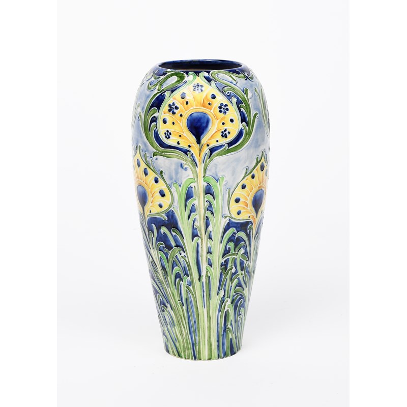 Peacock Feather a Florian Ware vase designed by William Moorcroft, shouldered, flaring cylindrical form, tubeline decorated with Art Nouveau peacock feathers, in shades of yellow, blue and green on a pale blue ground, printed factory mark, painted green signature, 25.5cm. high