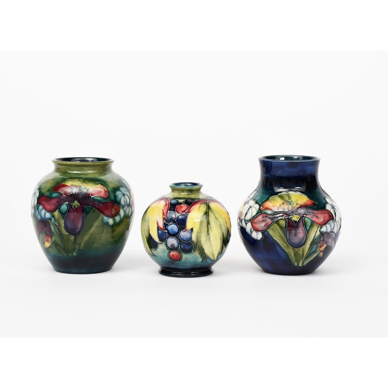 Leaf and Berry a Moorcroft Pottery vase designed by Walter Moorcroft, ovoid tubeline decorated in colours on a graduated green ground, and two Moorcroft Pottery Frilled and Slipper Orchid vases, impressed and painted marks, repaired chip to rim of one, 10cm. high (3)