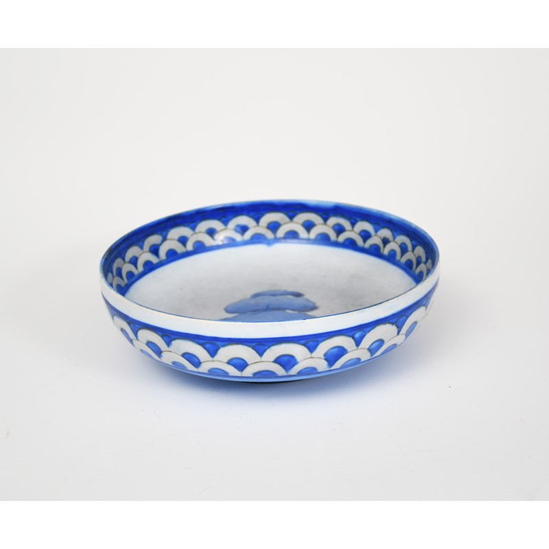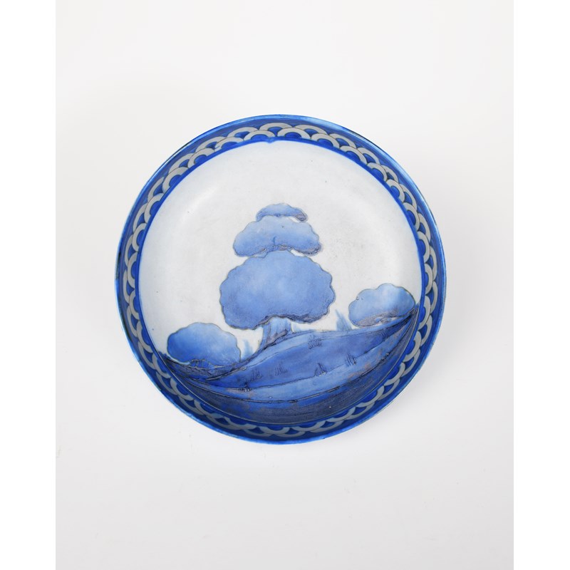 Dawn a Moorcroft Pottery bowl designed by William Moorcroft, on shallow threaded foot, tubeline decorated with trees in a landscape, inside scallop border in shades of blue, impressed marks, painted blue signature, threaded foot for pewter mount, 20.5cm. diam.