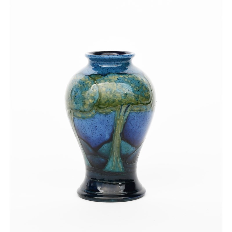 Moonlit Blue a Moorcroft Pottery vase designed by William Moorcroft, painted with a frieze of trees, in shades of blue and green on a blue ground, impressed marks, painted blue signature, 16cm. high