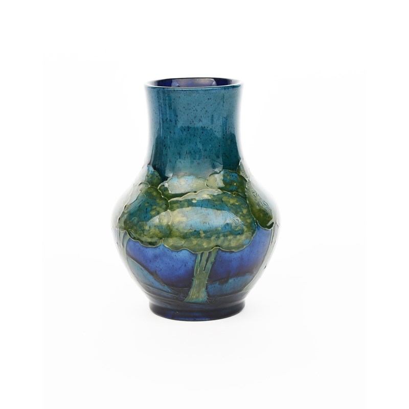 Moonlit Blue a Moorcroft Pottery vase designed by William Moorcroft, swollen cylindrical form, tubeline decorated with a frieze of trees in green and blue on a dark blue ground, impressed marks, painted blue signature, 16.5cm. high