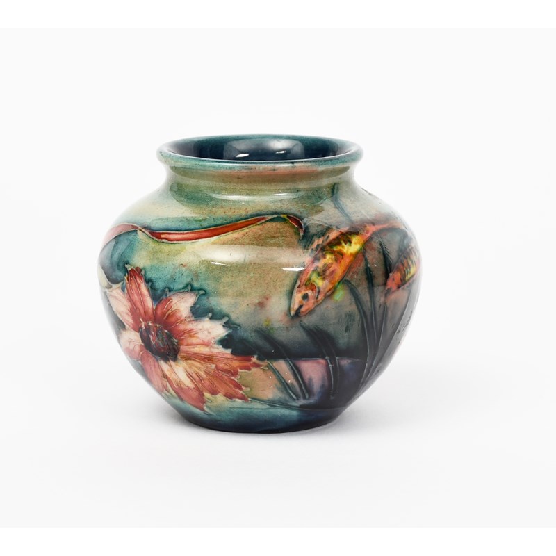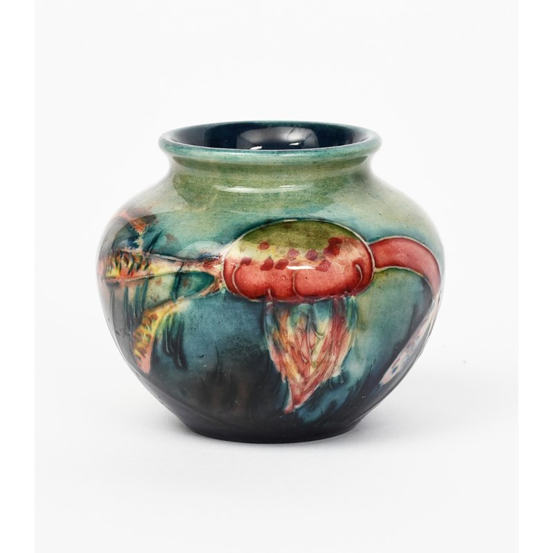 Fish a Moorcroft Pottery vase designed by William Moorcroft, ovoid, tubeline decorated with a shoal of fish and a jelly fish, in colours under a partial flambe glaze, impressed factory marks, 7cm. high
