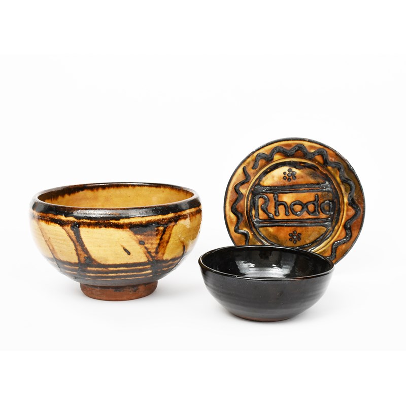 a Winchcombe Pottery footed bowl, slip decorated in brown and buff, a Winchcombe plate titled Rhoda and a small Sidney Tustin bowl,